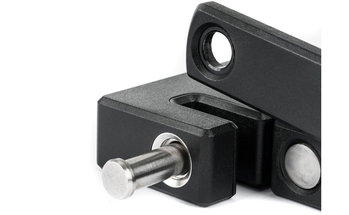 Einfaches Handling: Ein solider, gefederter Bolzen ermöglicht ein intuitives und schnelles Verschließen. Durch die flache Bauweise ist das Schloss besonders griffig und handgerecht.