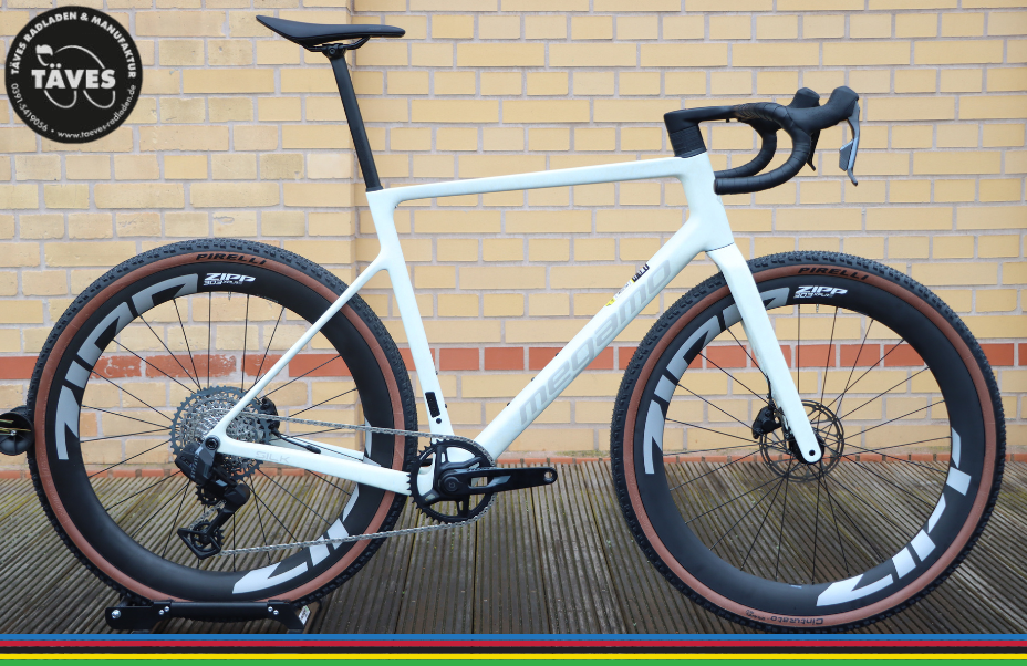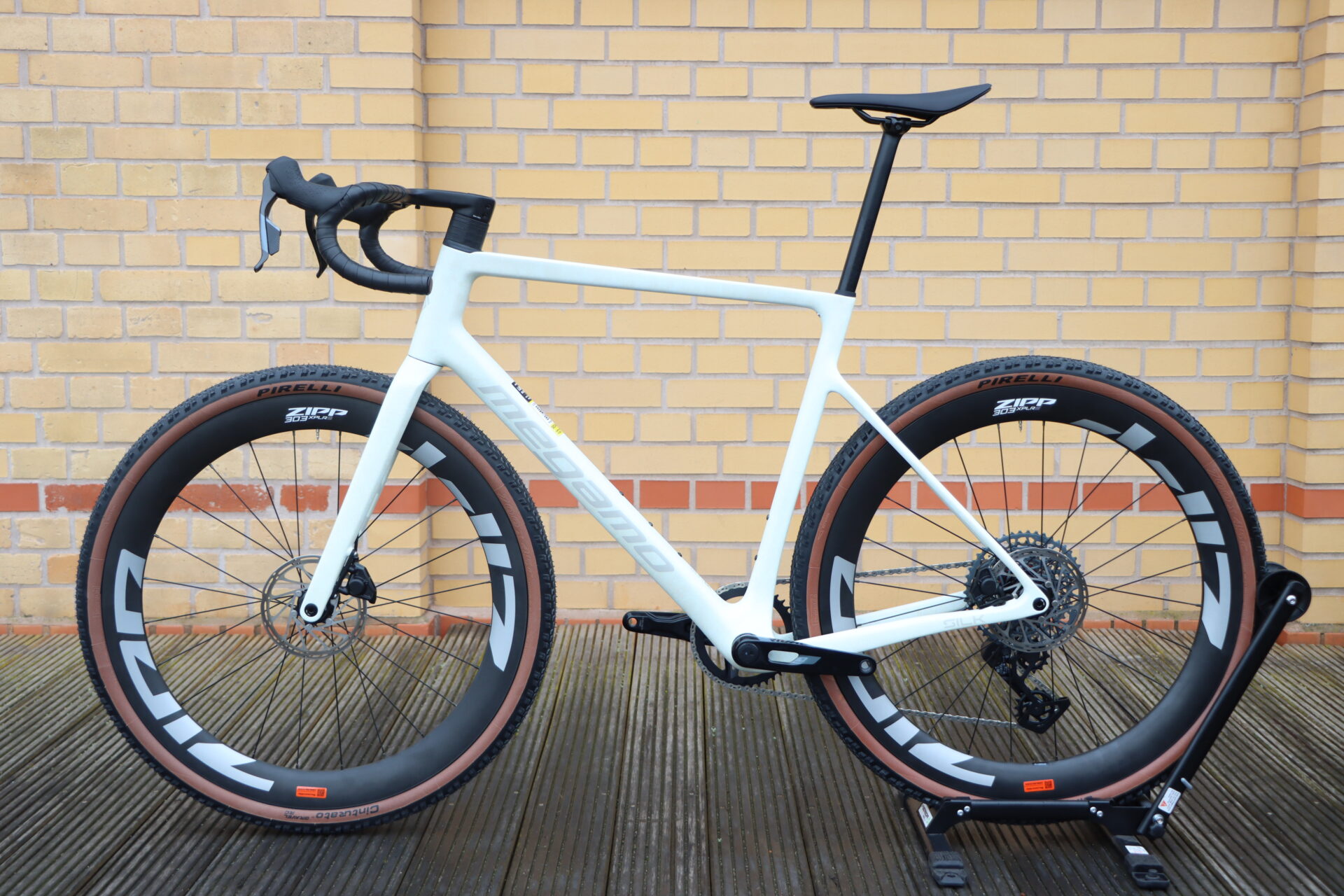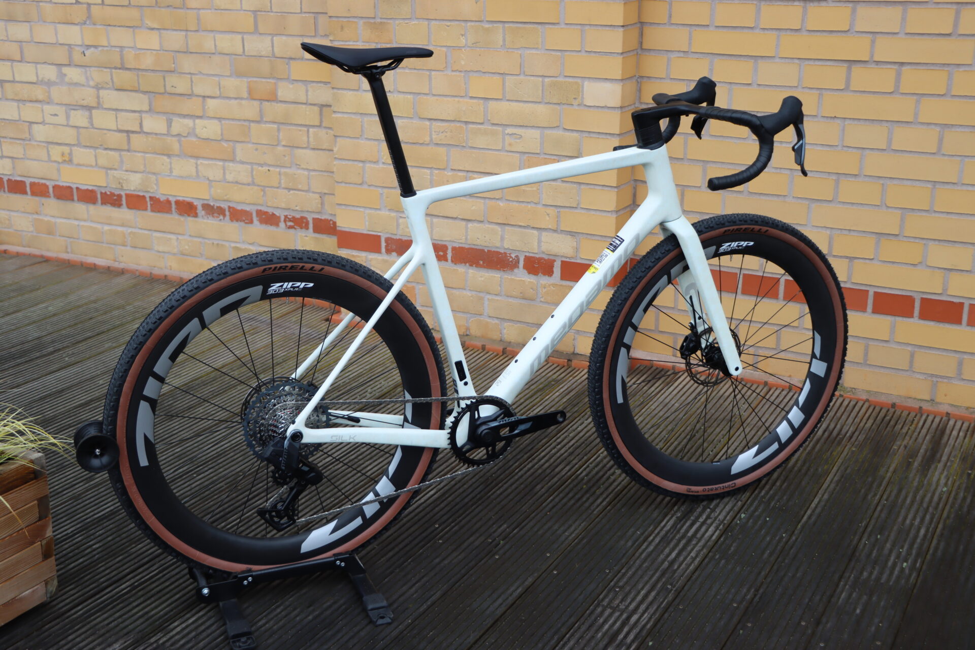 • Laufräder & Reifen: Hochwertige Carbon-Laufräder Zipp 303 XPLR S (Tubeless-ready) mit 54 mm Felgenhöhe und robuste Gravel-Reifen Pirelli Cinturato Gravel RC Classic (45-622 / 700×45c) — ideal für Schotter, Straße und wechselnde Untergründe.