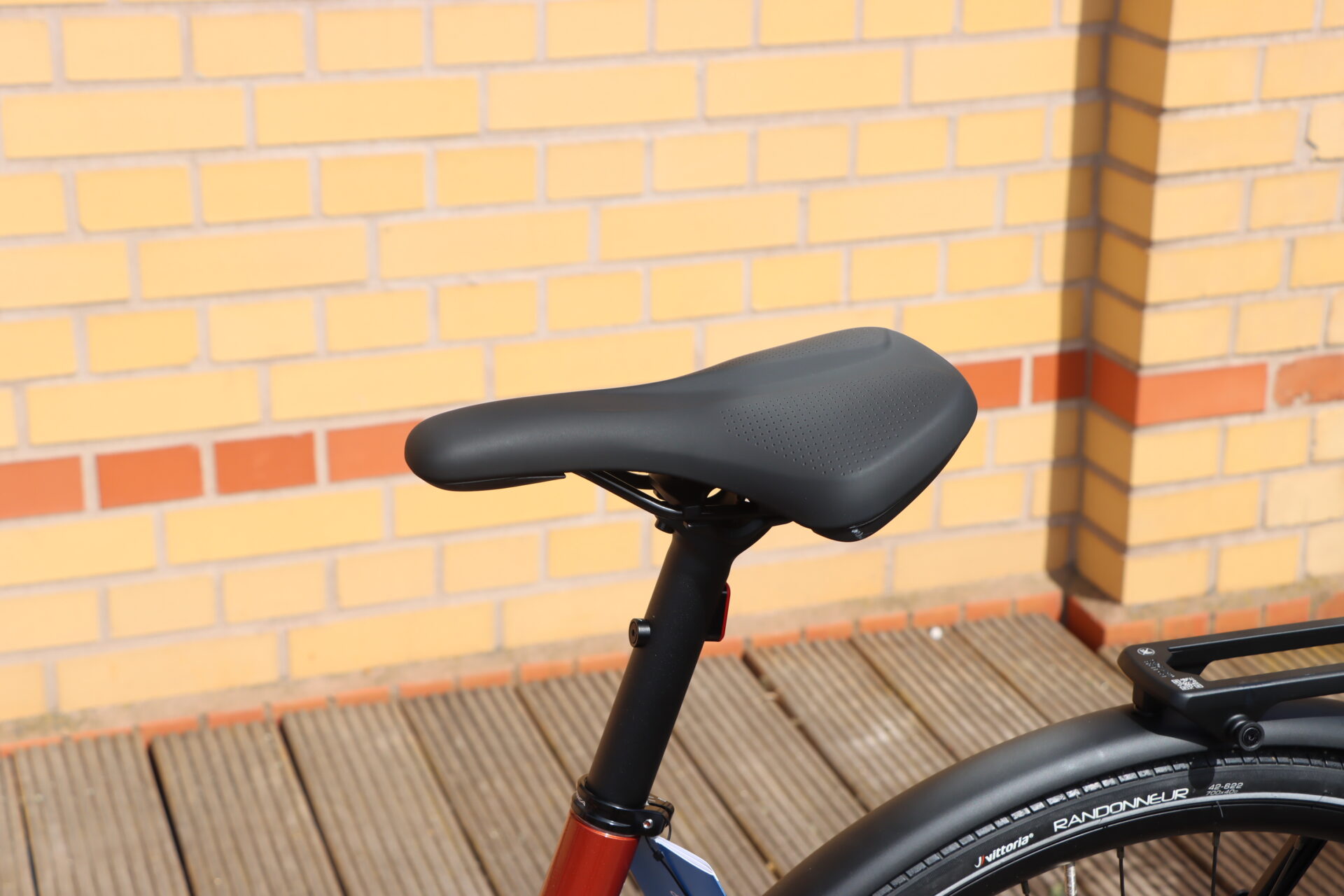 Leichte Carbon-Gabel: Ein echtes Qualitätsmerkmal in dieser Klasse! Die Gabel aus Carbon spart nicht nur Gewicht, sondern absorbiert feine Vibrationen von Kopfsteinpflaster und unebenem Asphalt für spürbar mehr Komfort.